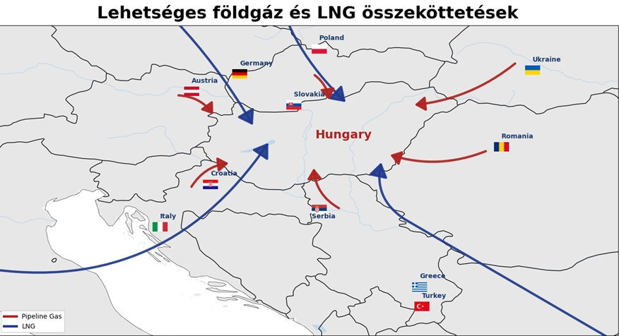 Visszatérve az elektrifikáció és a becslési nehézségek rövid említéséből, ebben az LNG szempontjából egyre bővülő környezetben ugyanakkor Magyarország különleges helyzetben van, hiszen nem rendelkezik tengeri kikötővel, így önálló LNG-terminálja sem lehet. Számunkra az LNG csak közvetett módon érhető el, más országok infrastruktúráján keresztül. A legkézenfekvőbb az említett horvát útvonal, illetve közvetve a német, olasz, görög, esetleg a török terminálokba érkező gáz behozatala a nemzetközi hálózaton át. Utóbbira példaként szolgál a 2023-ban elindult görög-bolgár és bolgár-román vezeték, amelyeken keresztül Azerbajdzsánból vagy Görögország LNG-kikötőiből is eljuthat a gáz Romániába, majd onnan a magyar hálózatba a vertikális folyosón való együttműködés részeként.