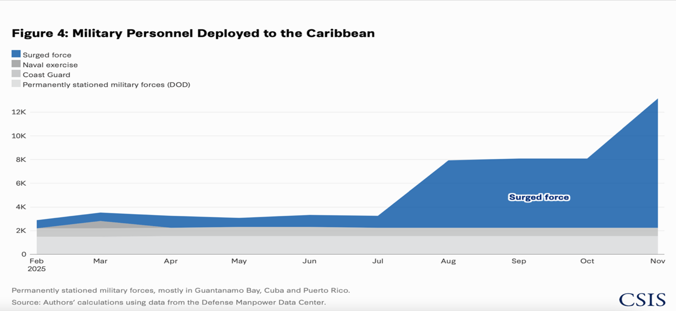 Recent deployments to Latin America throughout 2025, and particularly the Caribbean area, have included large ships with great firepower; a surge in the number of military personnel which have continued growing throughout the year, stationed in places such as Puerto Rico and Guantanamo Bay in Cuba; ten F-35s deployed to Puerto Rico in September, consisting of pilots and hundreds of ground support personnel; around 150 special operation troops aboard the afloat staging base, MV Ocean Trader; and the aircraft carrier USS Gerald Ford which has aboard 4,500 sailors and the three destroyers escorting the carrier holding 320 sailors.